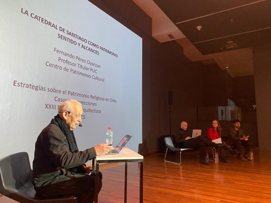 El también Premio Nacional de Arquitectura dio cuenta del trabajo que se ha realizado desde el CENPUC, en conjunto con el Cabildo Metropolitano, en materia de recuperación y preservación de la Catedral de Santiago, sus instalaciones y bienes muebles. Abordó, además, la transformación urbana de la manzana y la inserción de esta edificación en la ciudad de Santiago.
