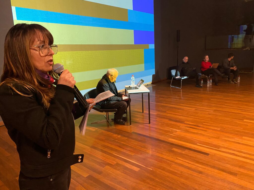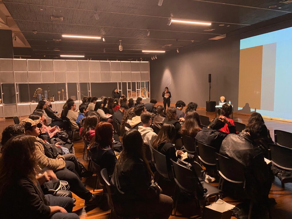 Luego de la bienvenida realizada por el arquitecto y miembro del equipo curador, Sebastián López, la directora del Centro del Patrimonio Cultural de la UC (CENPUC), Macarena Cortés, dio inicio a la instancia, agradeciendo a la organización y la presencia de las decenas de personas (estudiantes, académicos/as y público visitante) que llegaron hasta el GAM.