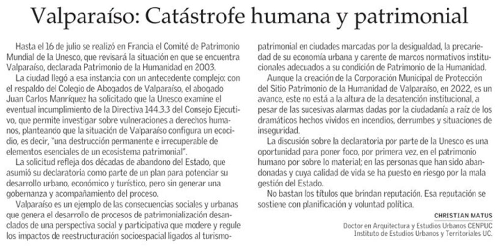 (El Mercurio) «Valparaíso: catástrofe humana y patrimonial». Columna de opinión del profesor Christián Matus.