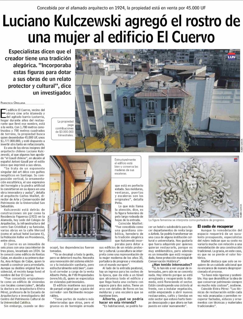 Las Últimas Noticias destaca que el edificio El Cuervo, vecino del cine arte Alameda y del barrio Lastarria y obra del arquitecto chileno Luciano Kulczewski, está a la venta. Habla la profesora Elvira Pérez, investigadora del Centro del Patrimonio Cultural y académica (Subdirectora) de la escuela de Arquitectura UC.